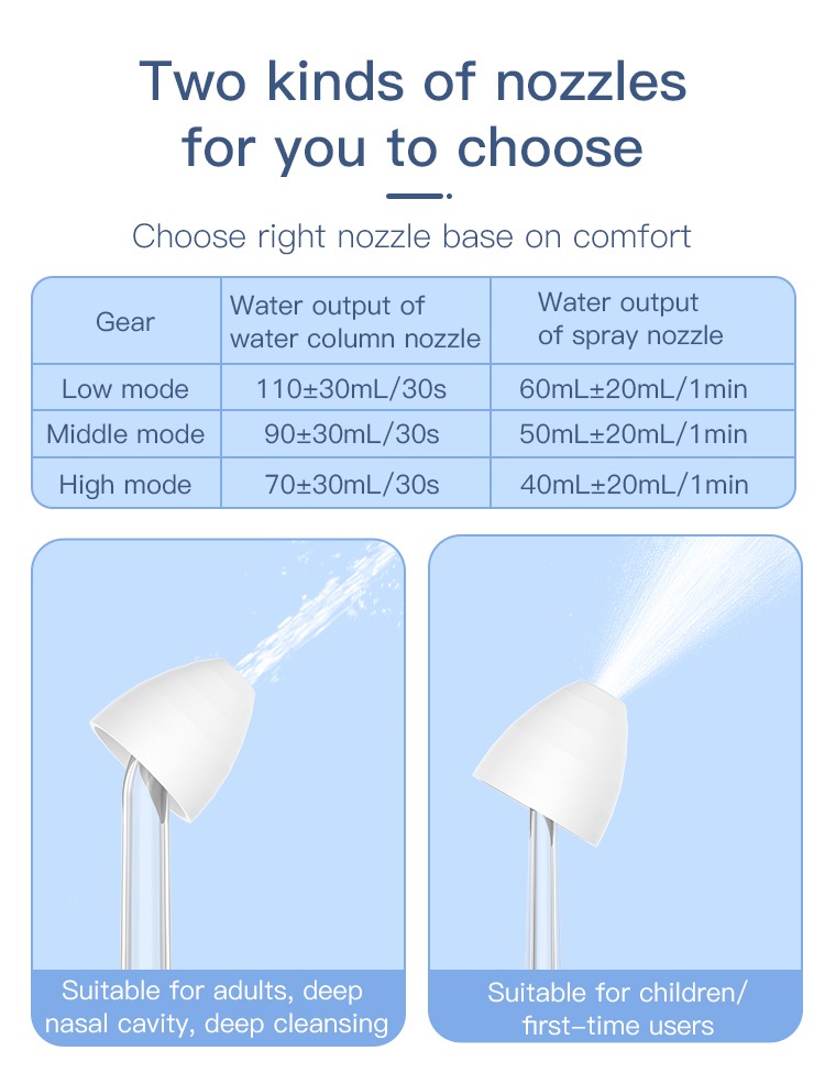 【Końcówki obrotowe o 90 stopni】 Konstrukcja końcówki obrotowej o 360 stopni w przypadku urządzenia do czyszczenia nosa jest skuteczniejsza niż w przypadku neti pot lub innych urządzeń do płukania nosa. Dzięki wodoodpornej konstrukcji IPX7, urządzenie do płukania nosa umożliwia płukanie całego ciała wodą, co ułatwia czyszczenie i pielęgnację jamy nosowej. |