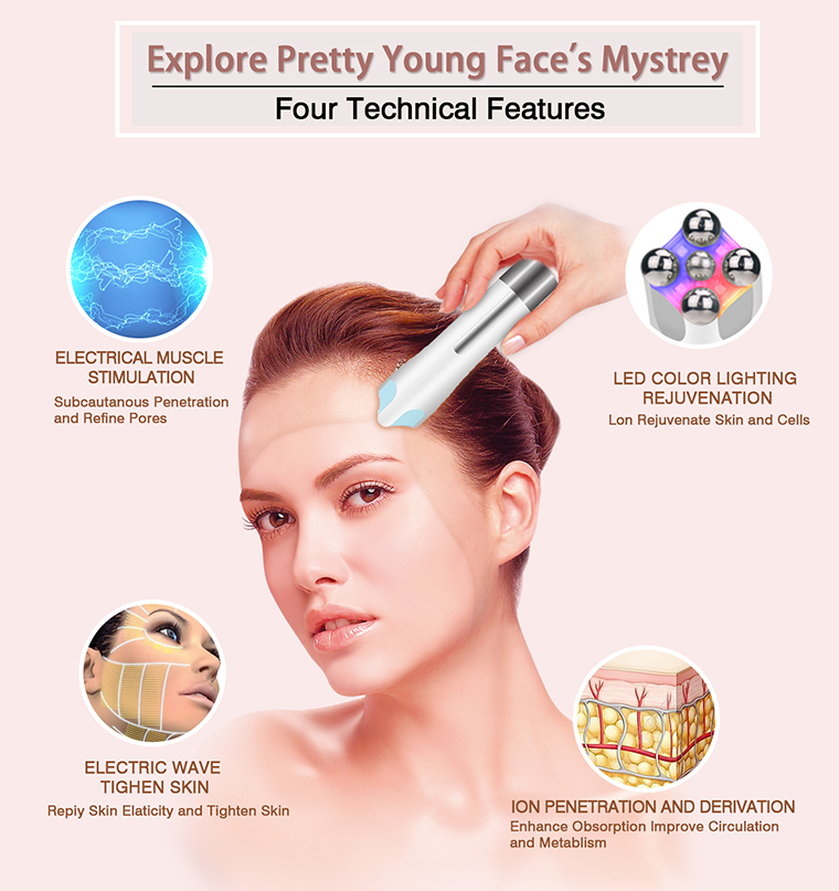 MASAŻ TWARZY O WYSOKIEJ CZĘSTOTLIWOŚCI - W trybach oczyszczania, penetracji, liftingu i pielęgnacji oczu, odczuwalne jest uczucie wibracji o wysokiej częstotliwości, które pomaga stymulować żywotność komórek i wspomaga krążenie krwi. Jest to więc właściwie także masażer do twarzy.