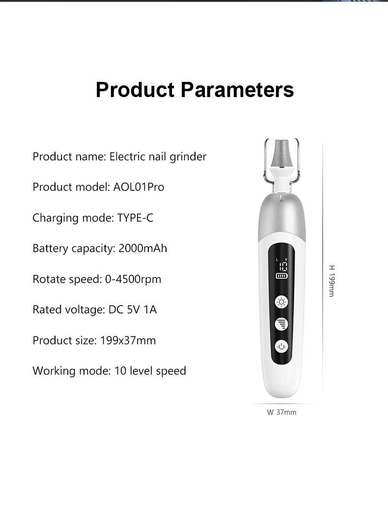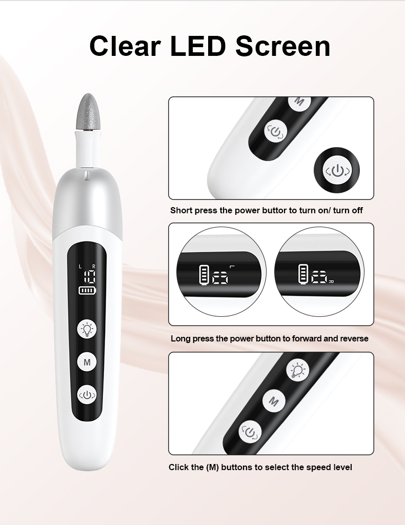 - INNOWACYJNY WYŚWIETLACZ LED: Bezproblemowa nawigacja po pożądanych ustawieniach. Wyświetlacz LED wskazuje stan baterii, preferowaną prędkość i ustawienia obrotów, co zapewnia bezproblemową obsługę. Elektryczna pilniczka do paznokci jest również wyposażona w zintegrowane światło LED, które oświetla obszary na dłoniach i stopach.
